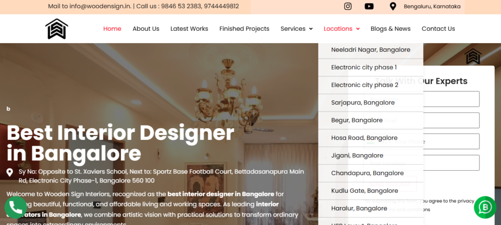 Design Cafe is one of Bangalore’s most tech-forward interior brands, offering design solutions for all room types — kitchens, bedrooms, living rooms, home offices, and more. Their digital design process, extensive gallery, and space-saving design expertise make them popular among urban apartment owners. They cater to a range of budgets and offer a detailed, visual-first approach that helps homeowners make confident decisions before committing. Visit: designcafe.com